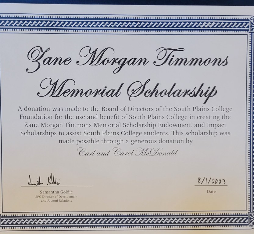 Zane left us in July of 2017 and in May of 2018 we gave away his first scholarship for South Plains College to a senior at Levelland High School. Our goal is to endow the scholarship to make it a “forever” scholarship in my baby’s name. In order for that to happen you need $10k ($2500 to start the fund and you have 3 years to fulfill the 10k). Once you get the full amount its frozen till the interest starts accumulating which is usually 3 years. Because of the fund itself being at 10k, the interest accumulation will take care of a two semester scholarship to a new LHS senior every year, basically forever. More will be explained in just a moment…